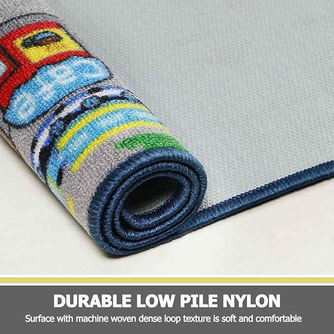 - 【Non Slip Kids Room Playmat Rug 】:Capslpad train car rug is made of high-quality nylon materials, the carpet are double-wrapped-durable and solid. the surface with machine woven dense loop texture is soft and comfortable, the back with TPR is non-slip, keeps rug in place well when the floor is dry, ensure safety for your children.