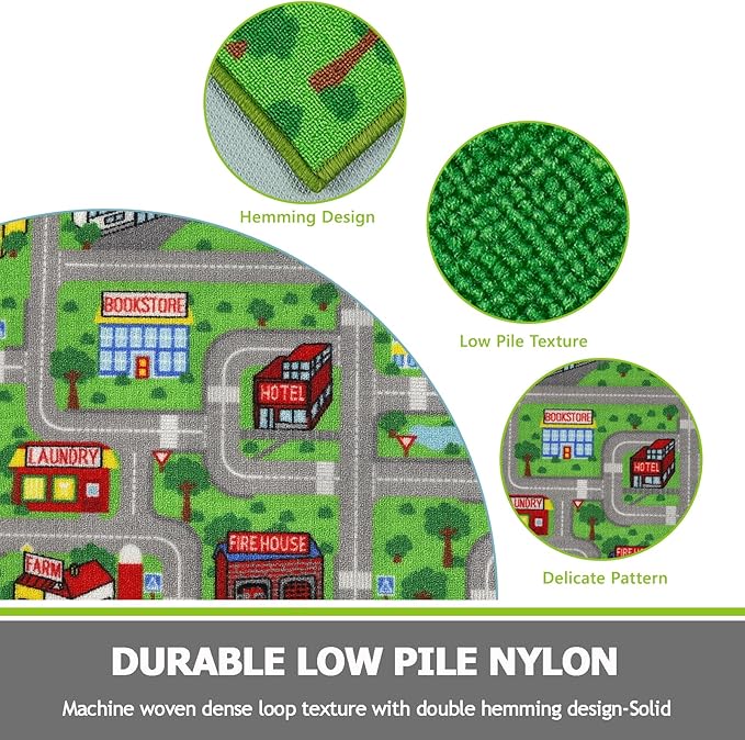 - 【Non-Slip Kids Carpet Playmat Rug】: Made of high-quality nylon materials,the surface with machine woven dense loop texture is soft and comfortable,rubber backing bottom has wear resistance and anti-skid property.Keeps rug in place well when the floor is dry and helps safe stepping for kids.