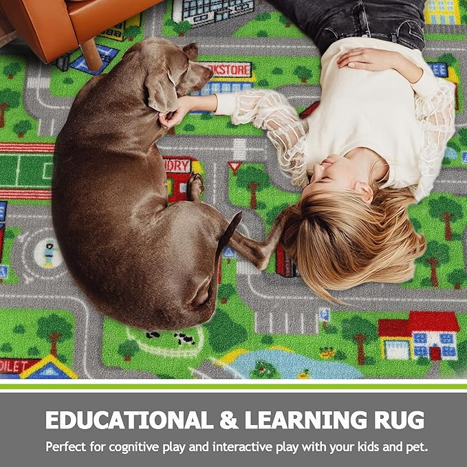 - 【Road Traffic Kids Car Rug Play Mat】:Includes more city buildings and locations : School,Hospital,Fire House,Police,Shop,Gas Station,Laundry,Book Store,Hotel,Bank,Farm etc. A great rug for playing with hot wheels car and This is a good way to teach children the various locations,Engage children in learning while playing.