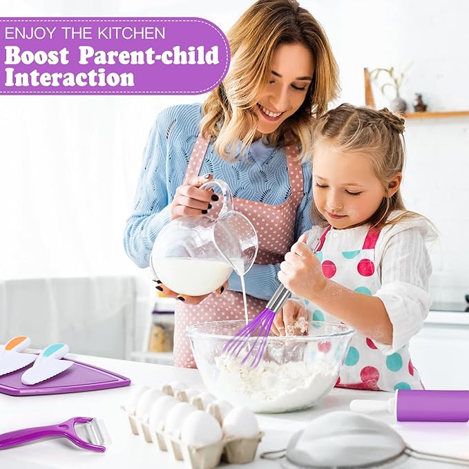 - 【KID SAFE KNIVES】Our cooking & baking utensils and accessories are designed with small size to fit the little chef, comfortable and safe for kids. All kids cooking tools are made from safe, nontoxic, food-grade material, which will cause no harm to your kids. It’s a perfect set for your children to build and improve their cooking and baking skills
