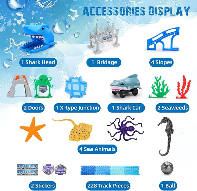 • Share Track Toys: This shark track toy combines ocean and racing themes; Track Playset Includes: 1 Shark Head, 2 Doors, 2 Stickers, 1 Bridage, 1 X-type junction, 1 Shark car, 4 Sea Animals, 228 Track Pieces, 4 slopes, 2 Seaweeds, 1 Ball