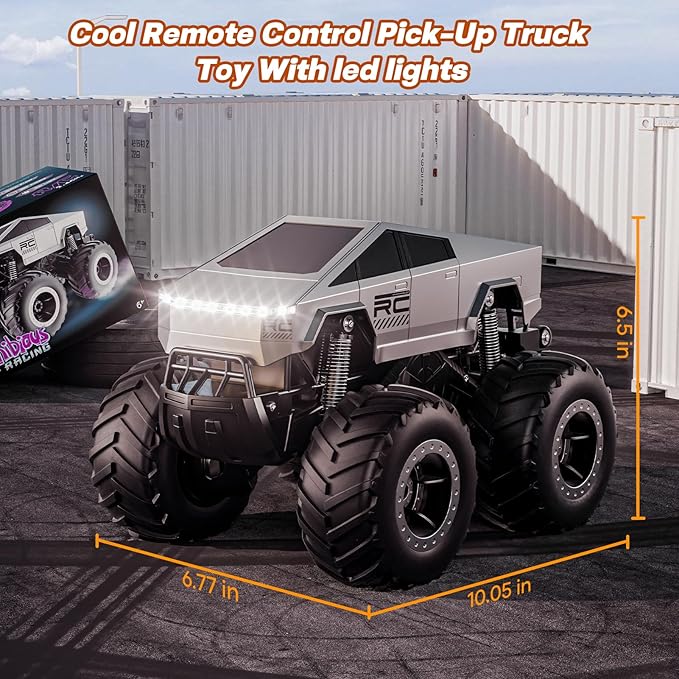 - Cool Remote Control Pick-Up Monster Truck Toy: Amphibious remote control car with led lights, this remote control car amphibious rc truck toy is made of flexible and sturdy high quality plastic and spray paint to ensure material safety, high hardness pvc material body and PA chassis, and dozens of screws and advanced electronic components fixed to ensure structural safety, super anti-collision, durable, fast acceleration, classic pickup truck styling, it's an ideal toy gift for boys and adults.