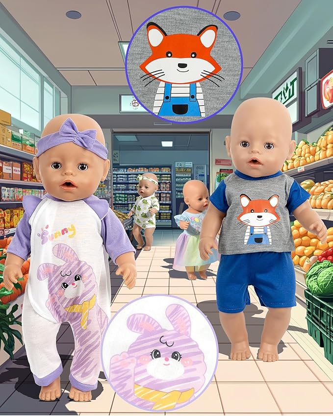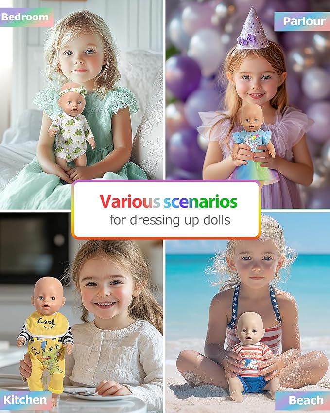 - Fit for Various Scenarios: Using this Baby doll clothing set dressing up dolls can be a delightful and creative activity for children.Your kids can play with baby doll, such as frog pyjamas for sleepover,unicorn rainbow dress for girl's birthday,dinosaur outfit for dinner and shark for outdoor Beach Day.Provide endless entertainment for girls and boys