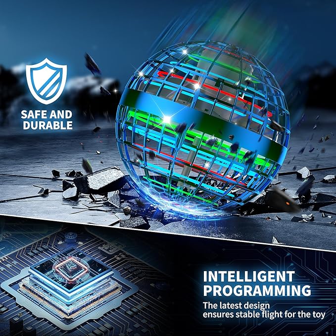 - Safe and Sturdy Design: Our Flying Orb Toy is made from premium ABS material, making it lightweight and soft for easy portability, perfect for indoor and outdoor fun. The spherical protective shell ensures safety, durability, and impact resistance. If it collides with furniture or other objects, it automatically stops, children can play worry-free