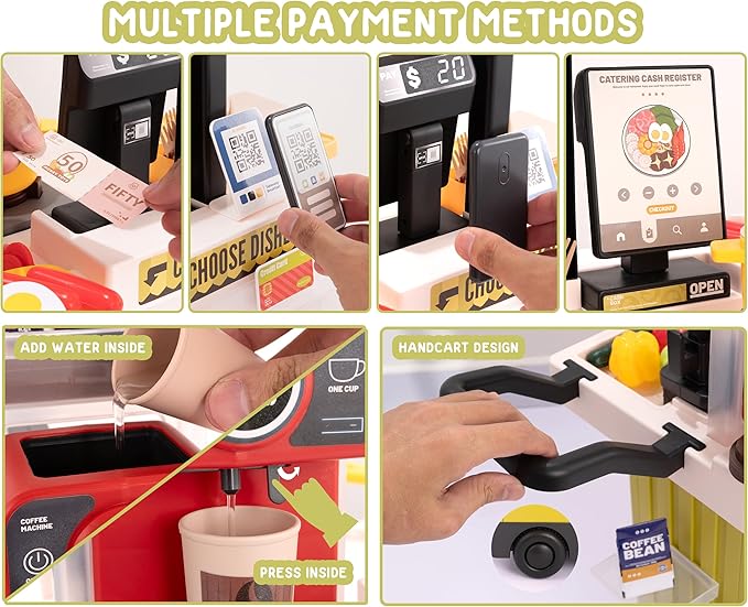 • Game kitchen set: This children's game kitchen set includes a variety of kitchen toys, food that changes color after cooking, simulated takeaway food packaging scenes, functional sinks with running water, ordering food and different payment games science that simulates life with cash, cell phone payment, bank card payment and many other payment methods and other accessories. Sticking matching stickers will make the whole suit more real.