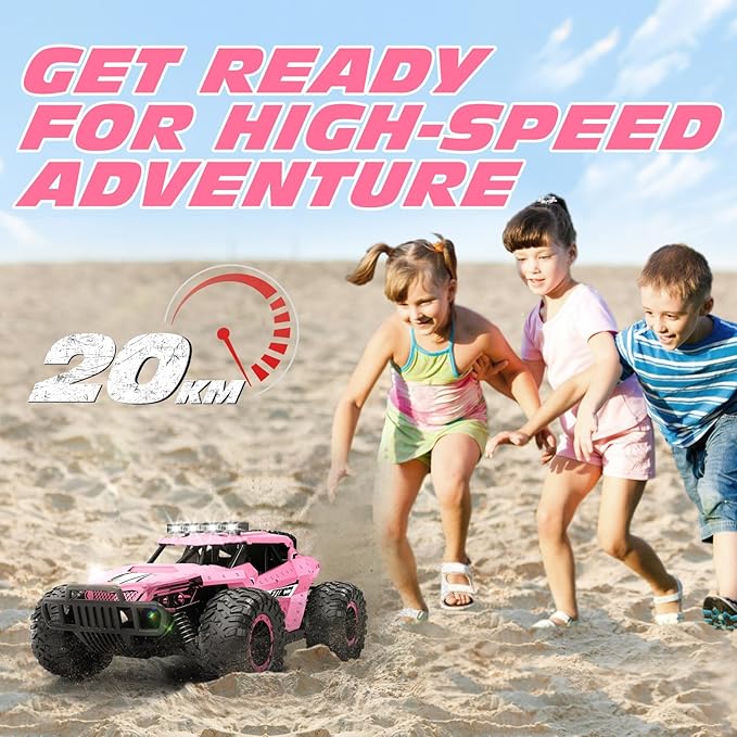 Tecnock Pink RC Car 1/16 Scale Remote Control Car for Girls, High Speed 20 Km/h All Terrains Rc Monster Truck with Two Rechargeable Batteries & Head Chassis Lights Gift Toy for Kids Adults