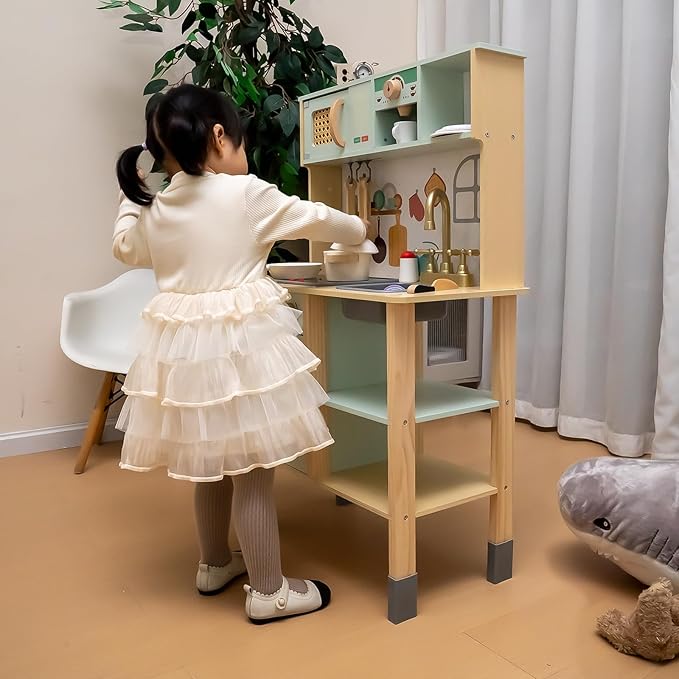 • STABLE CONSTRUCTION: The wooden frame provides excellent support and the stabilizing feet further ensure the stability of the wooden play kitchen, so they won't wobble even when kids place multiple kitchen utensils and food toys on them