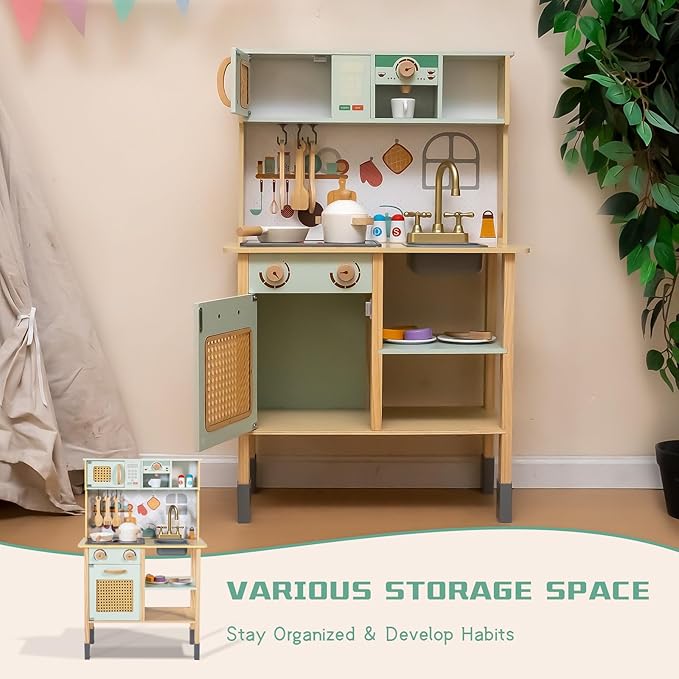 • VARIOUS STORAGE SPACE: The toddler kitchen has multiple shelving spaces, including the top shelf, hooks, and cabinets. Kids can place pots and pans in the right area, which not only keeps them neat and organized but also develops good storage habits