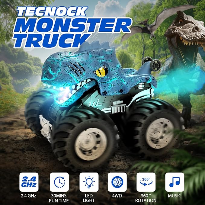 Tecnock Remote Control Monster Trucks Car, 360° Rotating RC Cars for Boys, 2.4GHz Dinosaur Toys with Spray, Light & Sound, Toys for Kids 6 7 8 Year Olds, Gift for Boys and Girls