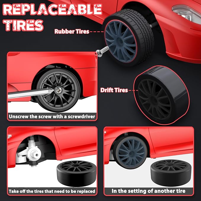 • Multi Function Toy: The RC cars is equipped with two types of tires, racing tires and drifting tires, which allows you to feel the different fun of racing and drifting. The two tires can easily switch to adapt to various scenes