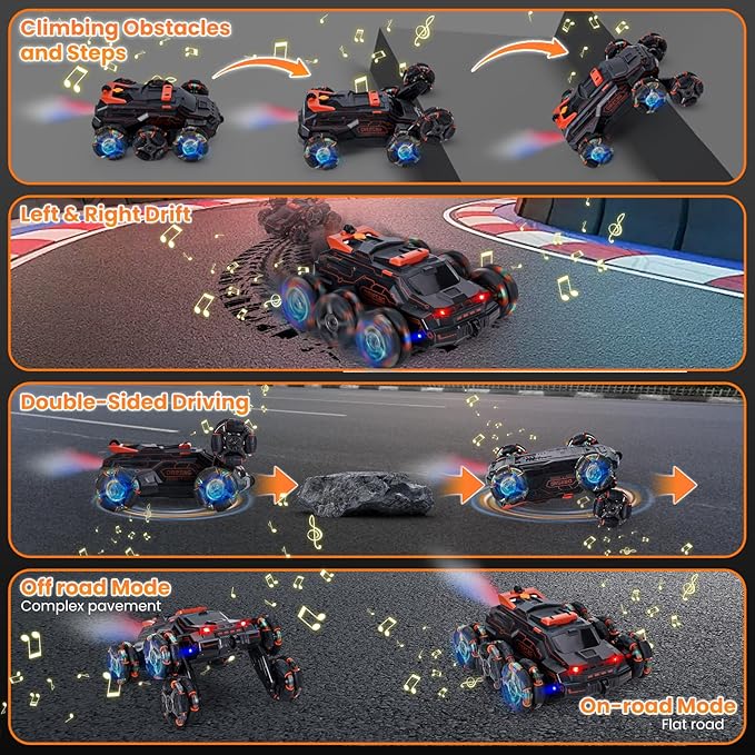- Cool Light & Music & Spray:The Super cool 6 wheels drift rc car with Colorful lights, dynamic music and cool spray. The rc car for boys mimics realistic engine roars, acceleration, and brake sounds. When Press the Auto demonstration button, the remote control cars will automatically show amazing stunt performances, allowing boys and girls to immerse themselves in driving fun and visual feasts