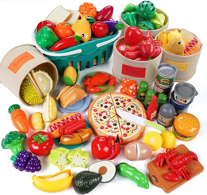 ilauke 87Pcs Cutting Play Food Toy for Kids Kitchen, Pretend Play Food Set for Toddlers with Interactive Cutting Kitchen Toys, Learning Toys Play Food Set for Daycare Educational Toy