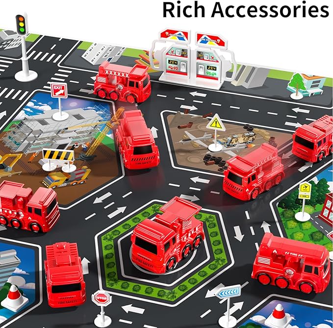 • Fire Airplane Toy: Big airplane toy(11.4*12.4*17 in) includes a toy airplane model with a garage that functions as parking and storage for 8 small car toys: 2 police cars, 2 ambulances, 2 taxis and 2 buses and activity playmat and some traffic signs