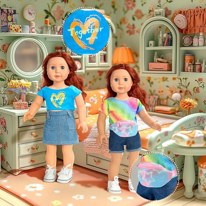 - Exquisite Design and Craftsmanship: From the vibrant cheerleading uniform to the intricate details of the Peace Love pink turtleneck set, each 18 inch doll clothes is made with carefully selected materials and attention to detail. The shimmering rainbow gown, and the classic cut of the retro denim outfit all reflect unparalleled quality and craftsmanship. Every stitch and pattern is a testament to meticulous artistry, making each doll outfit a miniature work of art.