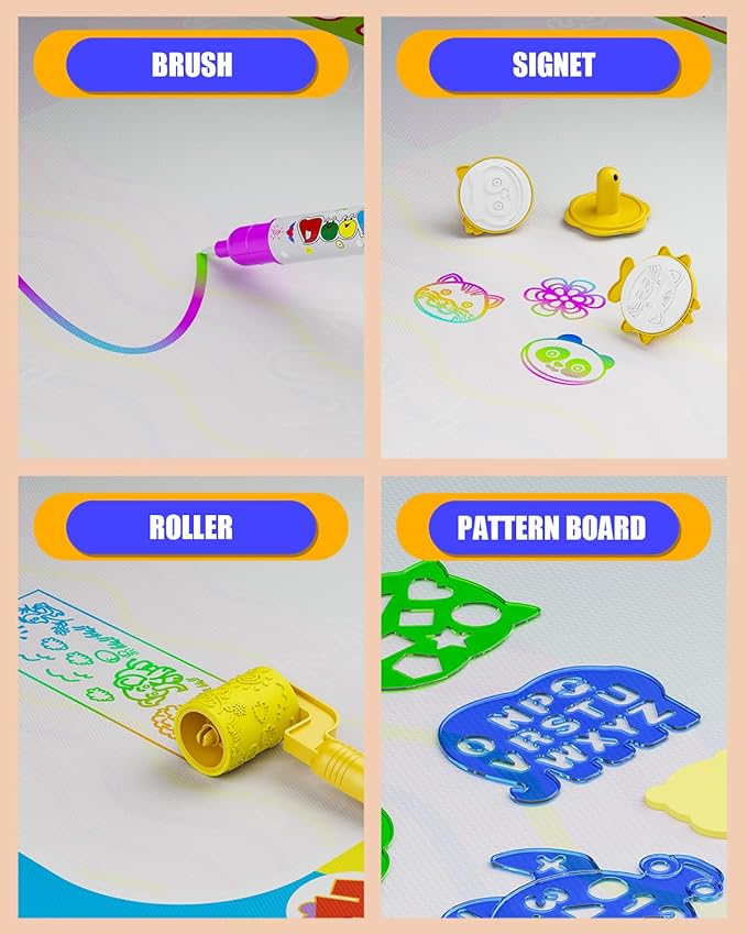 - 【Water Drawing Mat with Storage Backpack】Package contains: 1 doodle mat, 6 pens, 4 painting templates, 8 drawing molds, 3 stamps, 1 magic roller, 1 absorbent cotton stamp pad, 1 drawing manual, 1 drawstring backpack. This mess free coloring mat is light and foldable, easy to store. We also equipped it with a drawstring backpack that can store everything, which is convenient to carry with you. Whether at home, school or outdoor travel, it can be unfolded and used at any time.