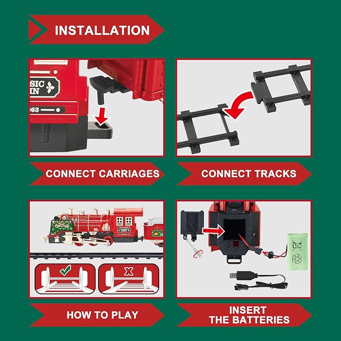 - STEAM TRAIN SETS: This train for christmas tree and real steam trains can produce smoke, the use of water rather than oil, you want to make the toy train set in the driving smoke, use our small bottle to add water to the christmas tree train set. You can try accompanying your child to make a circle under the Christmas tree with the track, so that the christmas train for tree runs around the Christmas tree, this is a very superb Christmas tree decoration. Tip:There is a water port next the chimney.