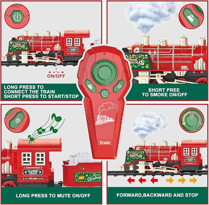 - RC TRAIN WITH LOTS OF FUN: Compared with ordinary toy train, our Christmas tree train has the feature of remote control operation, there are 6 kinds of operation commands, you can use the controller to make him go forward, backward, change the speed, stop, smoke, and make sounds. At first you need to use the remote control to pair frequency with the electric train set, after that you can realize the control of the christmas train sets for around the tree.Tip: This remote requires 2 AA batteries (not included).
