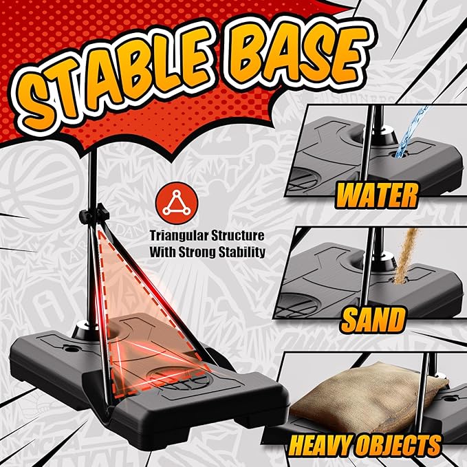 - High Quality & Sturdy Design: This upgraded kids basketball hoop is made of non-toxic, high-quality materials and comes with a thick, shatterproof backboard, sturdy steel rim and durable net. The triangular design of the base and pole enhances the stability of the basketball hoop, adding water or sand to the base further reduces wobbling and provides extra weight to the base of the basketball hoop for enhanced stability and greater safety.