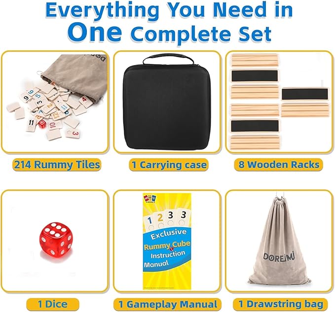 Upgraded Rummy Cube Game Set 6-8 Players with 8 Wooden Racks & 214 Rummy Tiles | Travel & Family Board Game for Adults and Kids