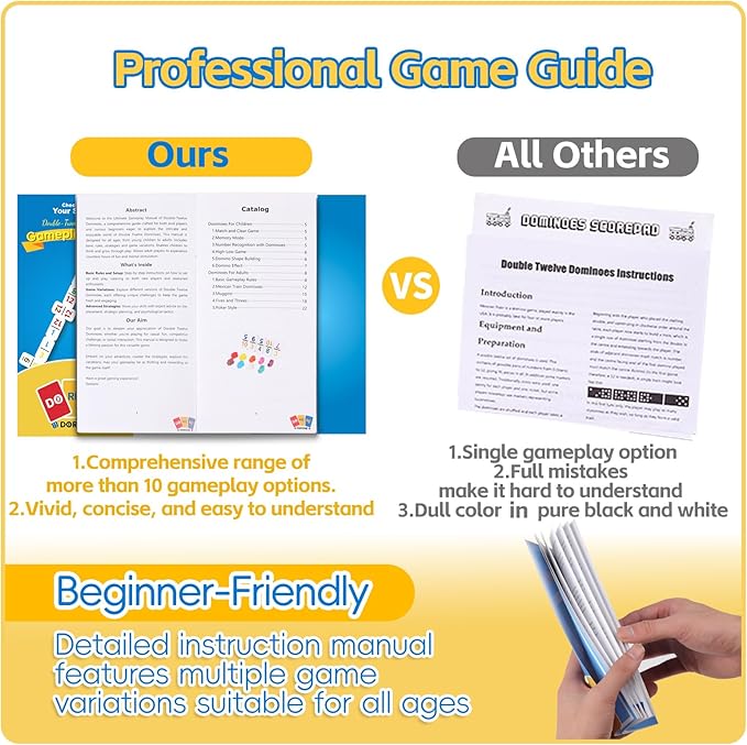 • Beginner-Friendly: Our Mexican Train Dominoes set comes with a well-designed manual, making it easy for newcomers to learn while offering advanced strategies for experienced players
