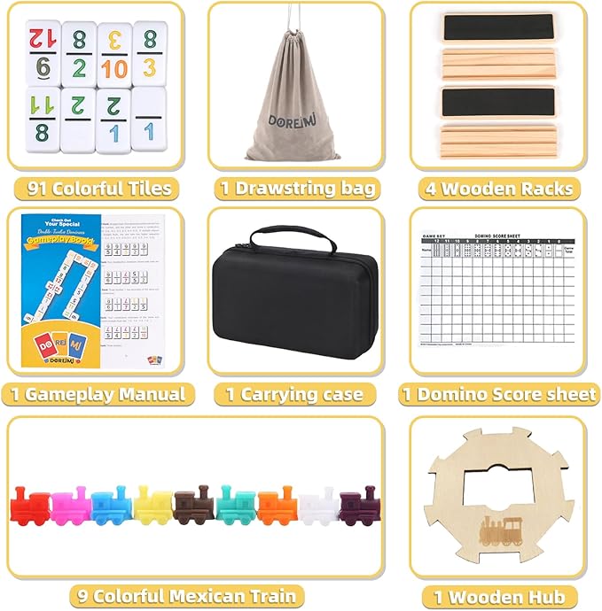 • 8 in 1 Mexican Dominoes Set: This domino board game Set is designed with 91 number domino tiles, 4 travel holders, 1 EVA case,1 drawstring bag, 9 trains, 1 exclusive game manual, 1 scorebook and 1 hub