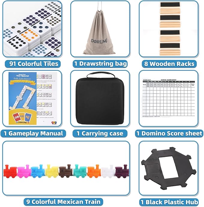 • 8 in 1 Mexican Dominoes Set: This domino board game Set is designed with 91 dot domino tiles, 8 travel holders, 1 EVA case,1 drawstring bag, 9 trains, 1 exclusive game manual, 1 scorebook and 1 hub