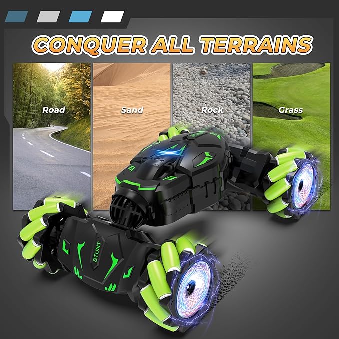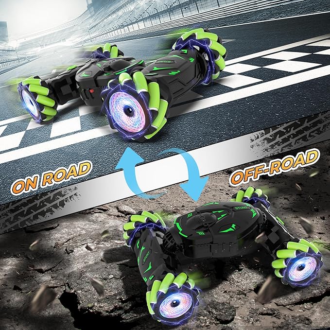 - Stunt Master & Ultimate Terrain Conqueror: Gesture sensing rc stunt car can drive and drift in all directions, 45° climbing, 360° rotation, double-sided flip, snaking, twist into off-road and on-road modes. With a powerful motor and 4WD, the hand controlled rc car can conquer all terrains, such as sand, grass, mud, rocks, etc with a fast speed. Play the birthday gifts for boys no matter indoors or outdoors