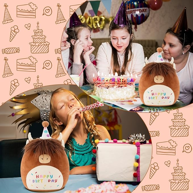 • 【Creative Plush】 The Birthday highland cow stuffed animal has a lovely facial expression, it wears a colorful birthday hat on its head, and on its belly are embroidered the words "HAPPY BIRTHDAY", a cute appearance full of attraction.