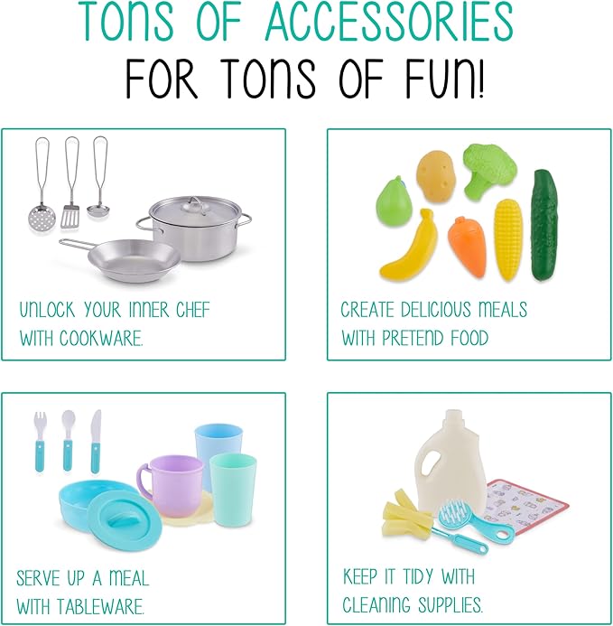 - BONUS TOOLS & ACCESSORIES | Tots Can Start Playing Straight Out the Box with Free Kitchen Toys [Pot w/ Lid, Frying Pan, Spatula, Whisk, Food, Cleaning Supply, Tableware] for Creative Play | Kitchen Also Features Other Authentic Details Like Lights, Sounds, Clicking Knobs, Door Handles, & Cabinet Windows