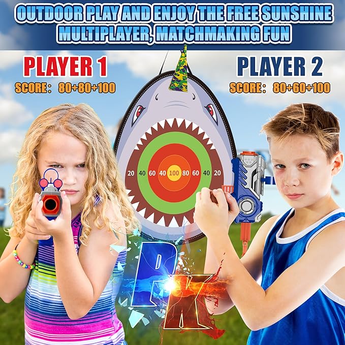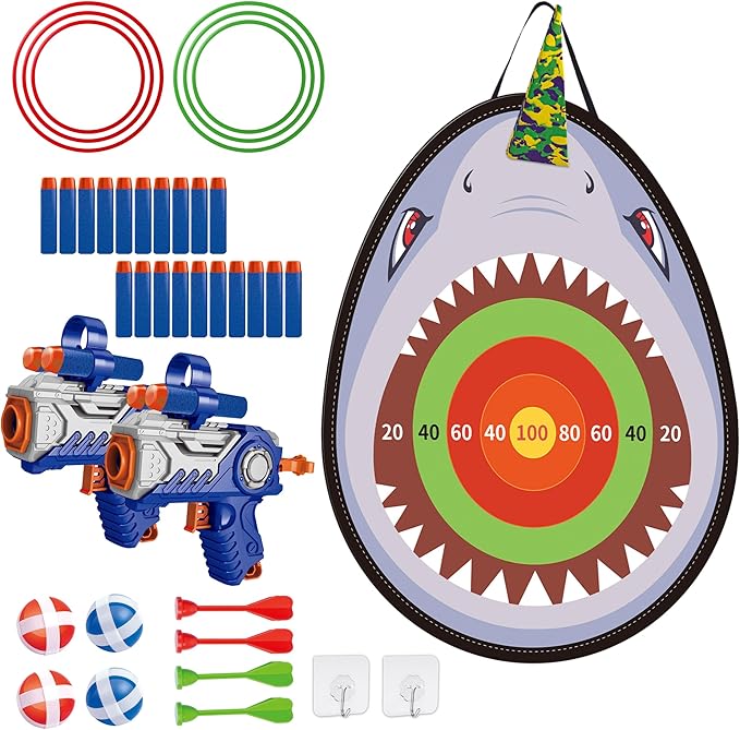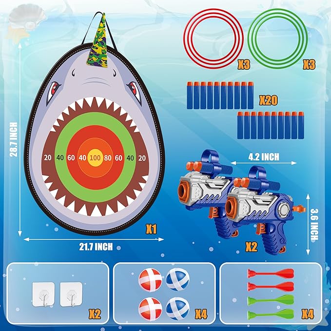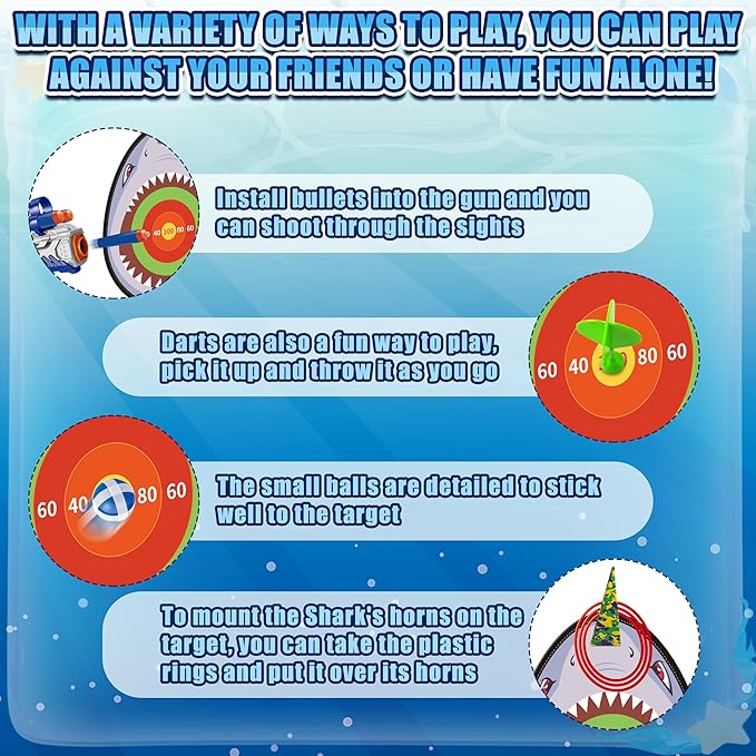 • Dart Board for Kids: Shark Dartboard’s diameter is 28.7 inches that improves the chance of a hit. Dartboard toys for ages 8-13 contain gun, sticky Balls, Darts and Rings and so on. Multiple ways to play, birthday party games for kids