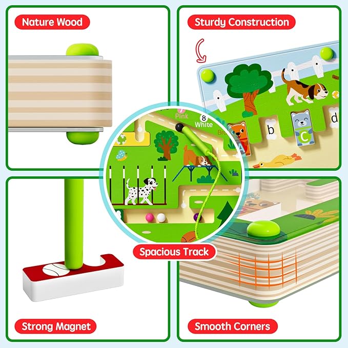 • Material: The magnetic maze game board is made of high quality natural wood. Non-toxic, harmless and odorless. Each bead and car is firmly fixed under the acrylic transparent plate and will not fall apart.