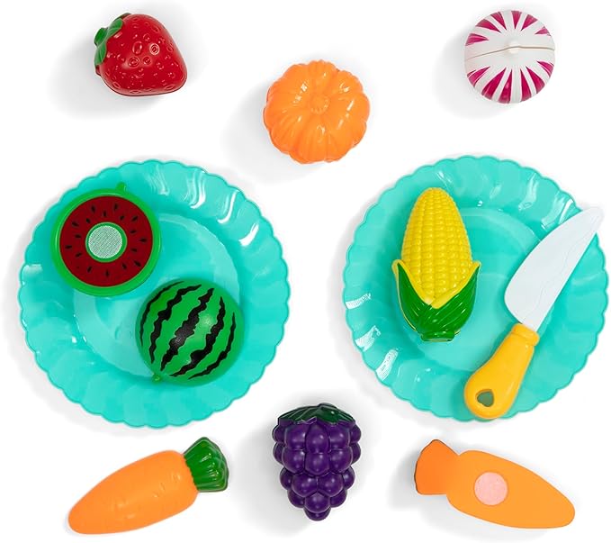 - 20 ACCESSORIES INCLUDED: Kitchen comes with 20 play food accessories | Play fruit, vegetables, dishes, cups and ice help kids exercise their creativity and imagination | Using utensils and serving pretend meals improves grasp, dexterity and motor skills