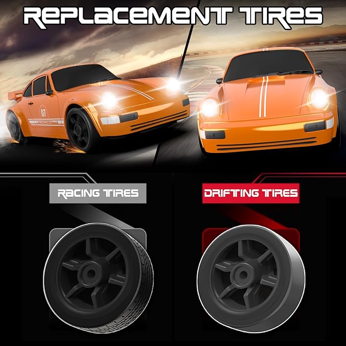 - Replaceable Tires And Mesmerizing LED Light: RC drift cars toy comes with a double set of removable tyres, four rubber racing tyres and four drift tyres. The drift tyres allow you to enjoy drifting on smooth boards and tracks, while the rubber tyres allow you to enjoy speed and racing on good road conditions. In addition, the LED lights on the race car include headlights and taillights/brake lights, which are designed to not only illuminate the road ahead with unrivalled clarity, but also enhance the irresistible glamour of night driving