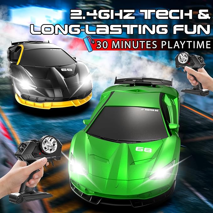 • 2.4 GHz And Battery Life: Our remote drift control car boasts a 2.4 GHz remote control system that automatically pairs upon start-up, allowing two or more rc cars to race together seamlessly without signal interference. Powered by a 3.7 V 500 mAh rechargeable battery, it ensures boys and girls can enjoy a super-long gaming experience, filled with endless fun and excitement