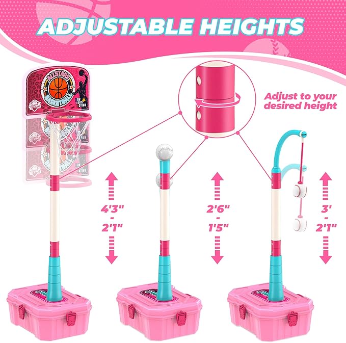 4-in-1 Toddler Basketball Hoops and T-Ball Set, Height Adjustable Kids Basketball Hoops, Baseball Launcher, Indoor/Outdoor Hanging T-Ball Baseball Toys for Boys and Girls Ages 3+(Pink)