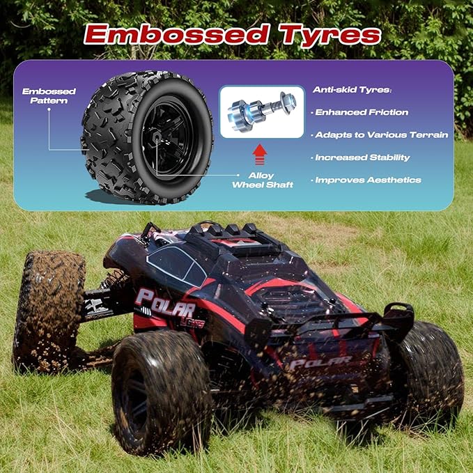 - All Terrain Monster with Advanced Suspension: Metal oil filled shock absorbers can absorb bumps and provide a smooth driving experience, allowing you to conquer any road surface such as grass, mud, sand, or sidewalk. The metal differential and gear system ensures optimal traction, while adjustable tie rods enhance steering precision. Built for off-road adventures!