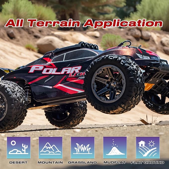 - Rugged and Water Resistant Design: The high strength PVC shell resists cracks, while the ABS chassis withstands hard impacts. Equipped with a 6KG waterproof servo and metal-reinforced drivetrain, this RC truck handles jumps, flips, and rough terrain without damage.