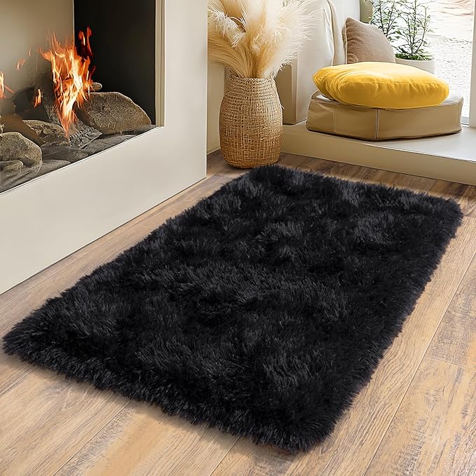 Super Fluffy Area Rug for Bedroom, Modern Shag Black Small Throw Rugs, Soft and Cozy Plush Carpet for Kids,Girls Boys and Teens Decorations for Living Room Dorm Nursery Classroom, 2x3 Feet