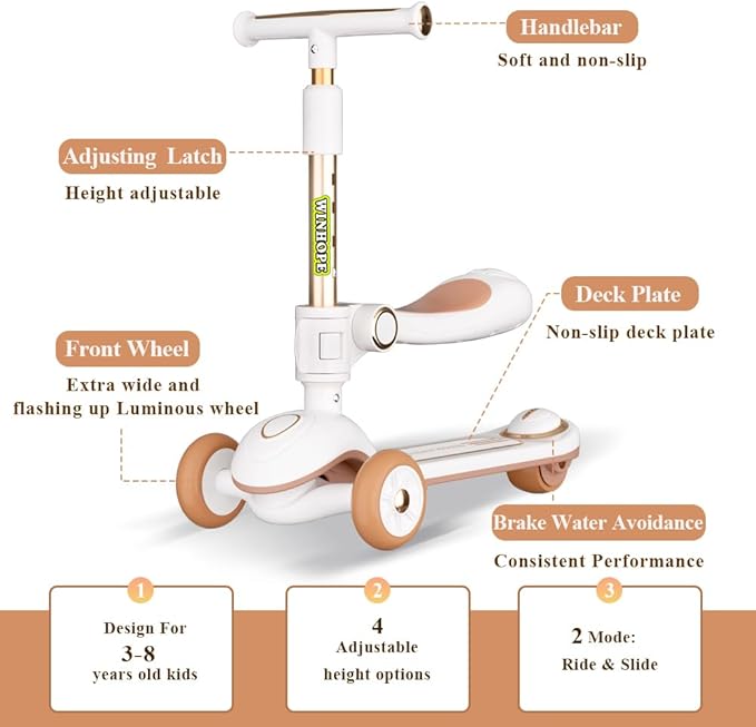 Winhope Kick Scooter for Kids, 2-in-1 Kick Scooter with Wide Deck,Folding 3 Wheel Children Scooter Outdoor Ride-On Toys for Boy Girl Aged 3-8