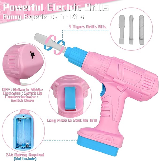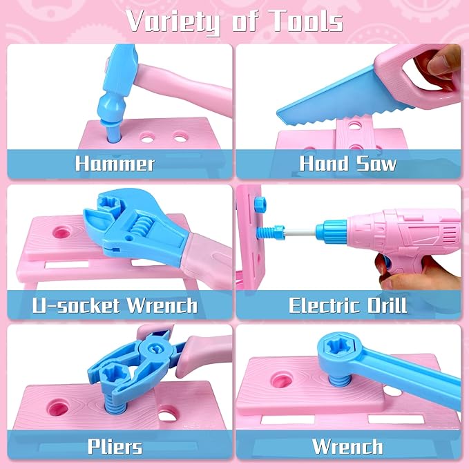 • Realistic Kids Tool Set for Hands-On Play. This 55-piece kids toddler tool kit includes a pink vest, tool belt, spinning battery-powered drill, hammer, screwdriver, wrench, and pliers, and screws that you can actually screw, offering a truly realistic play experience.