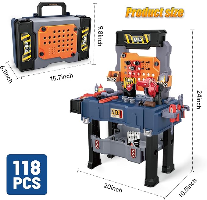 - Tool Box & Workbench in One : Toy Construction Tools set has a large storage space for organizing tool accessories, helping your child develop good storage habits and say goodbye to mess. When playtime is over, this tool playset easily transforms into a portable toolbox, perfect for carrying or storing at home, while traveling, or even at parties