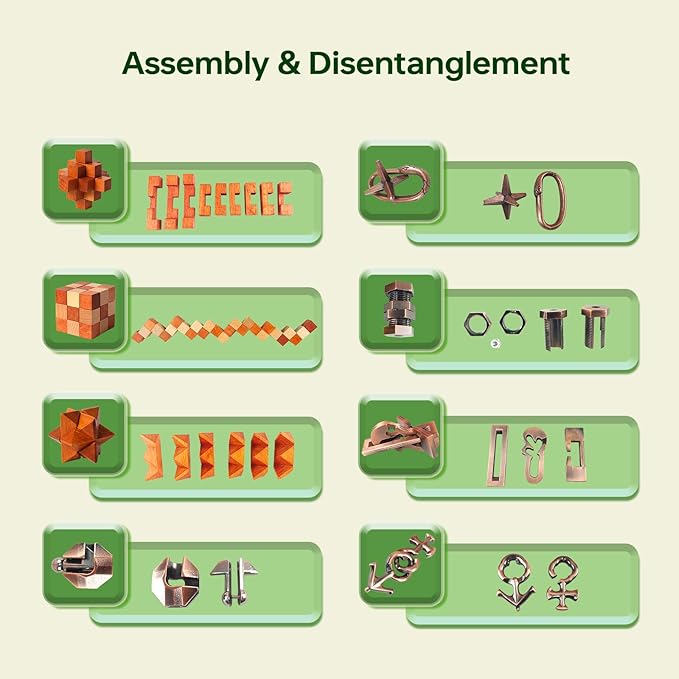 • Wooden and Metal Puzzles: 8 pieces of puzzles for adults and kids, enjoy brain teaser puzzles games can avoid gadgets and electronics, learning with novelty idea, exercise dynamic brain skills.