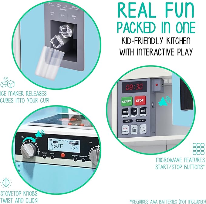 - SUPER REALISTIC SIGHTS & SOUNDS | Much More Than a Toy, Our Interactive Design Enables Meaningful STEM Learning as Boys & Girls Immerse Themselves in a Real Kitchen Setup | Elements Include Pretended Ice Dispenser, Microwave with Light & Sounds, Stove Top with Realistic Sound and light, Battery Operated Range hood, Lighting oven, Clicking Knobs, Twisting Dials, Labels & More