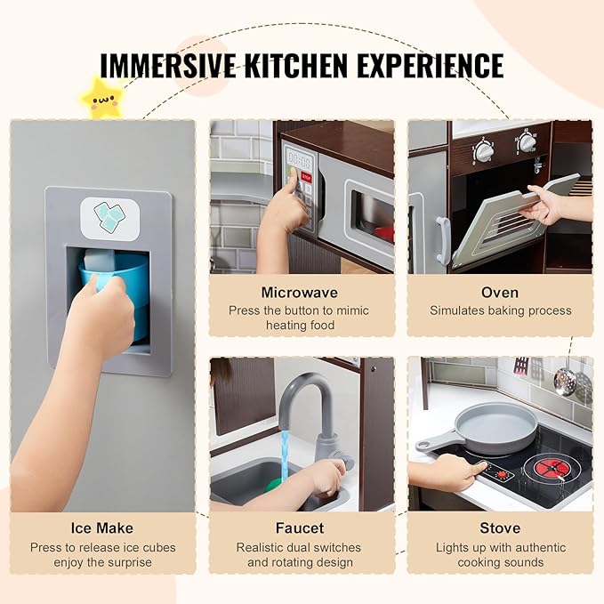 - Easy to Assemble & Built to Last: This kids wooden kitchen playset is built to endure and comes with clear, simple instructions for quick assembly. Both kids and parents can get right into the fun without any hassle. Enjoy a durable toy that provides lasting playtime enjoyment!