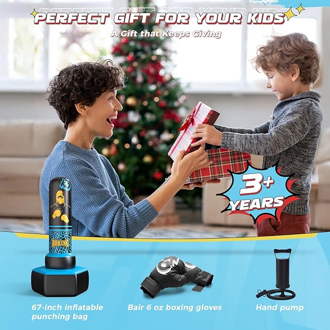 - Perfect Gift for Kids: This 67-inch blue freestanding punching bag comes with boxing gloves and a manual pump. The punching bag set is the ideal birthday or Christmas gift for kids aged 4-12, especially for kids who enjoy martial arts, karate, or taekwondo