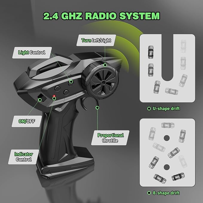 - 2 Tire Configurations: Drift car comes with 4 speed racing tires and 4 drift tires. When you want to show off this rc drift car with stunts, you can use drift tires,with better handling and perfect agility, and when you want to make it a sports car, the racing tires will be your best choice