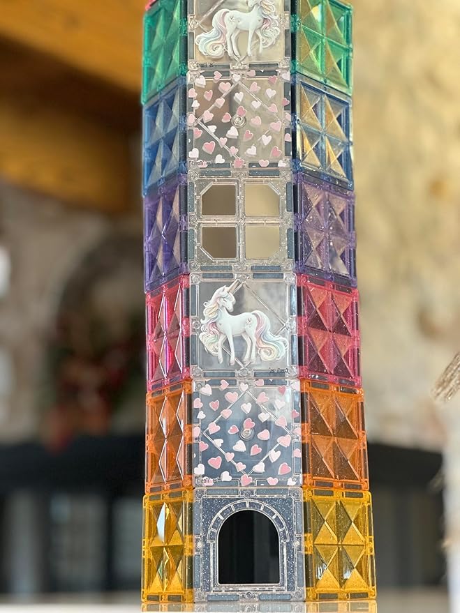 - What’s Included: 52 magnetic pieces designed for creativity and fun: 28 Glitter Tiles (14 Squares, 7 Equilateral Triangles, 7 Isosceles Triangles), 4 Magical Unicorn Tiles, 2 Rainbow Tiles, 6 Star Tiles, 6 Heart Tiles, 4 Windows, and 2 Doors.