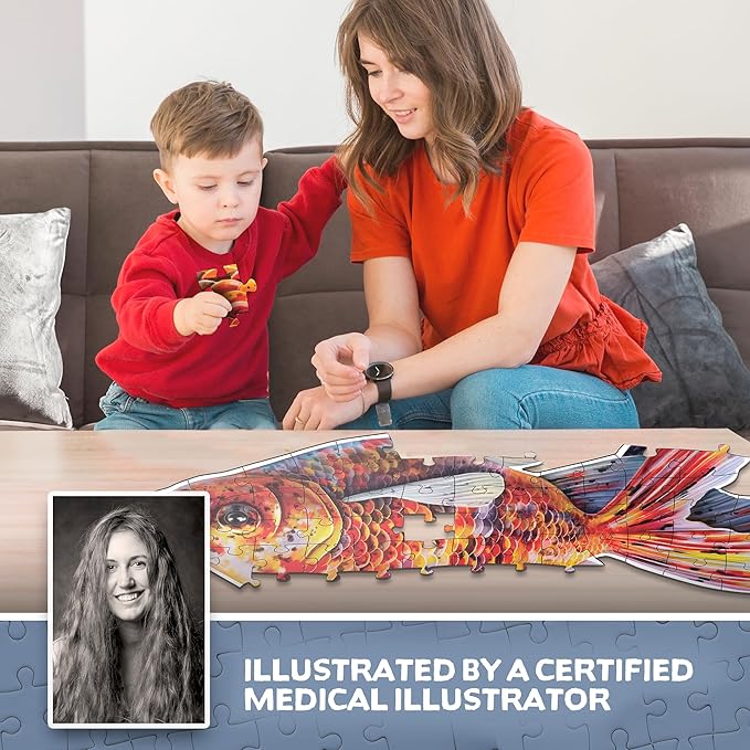 - DOUBLE SIDED DESIGN: This Fish Animal jigsaw puzzle boasts a unique double-sided design. On one side, you’ll be enchanted by the vivid artwork of the Calico Goldfish, showcasing its striking colors and fluid movements in its aquatic environment. On the other side, you'll discover a scientifically-accurate reconstruction of the animal's anatomy. This dual-sided approach offers both aesthetic appreciation and educational value, making it a versatile learning tool.