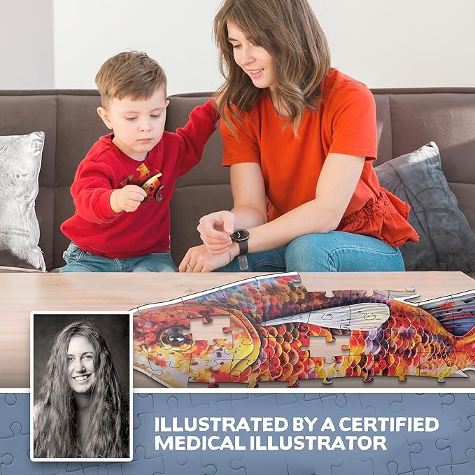 - DOUBLE SIDED DESIGN: This Fish Animal jigsaw puzzle boasts a unique double-sided design. On one side, you’ll be enchanted by the vivid artwork of the Calico Goldfish, showcasing its striking colors and fluid movements in its aquatic environment. On the other side, you'll discover a scientifically-accurate reconstruction of the animal's anatomy. This dual-sided approach offers both aesthetic appreciation and educational value, making it a versatile learning tool.
