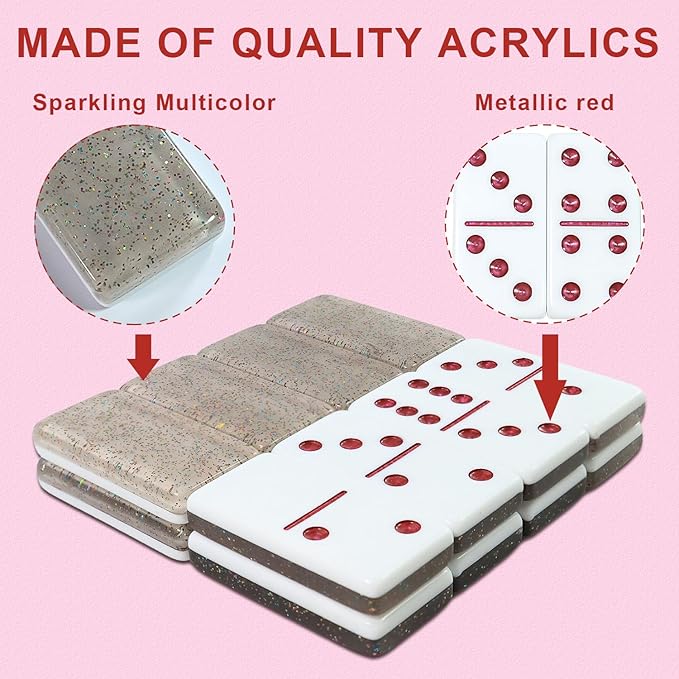 • [PRODUCT DETAILS] : Domino set of 28 pieces, is a classic acrylic board games domino, Excellent quality and reasonable price. And matched With Gift Box and 7 Polyhedral Dice, Each domino size: 1.95*0.98*38 inches ( 28pcs domino wooden box 7.7*4.56*2.2 inches ).